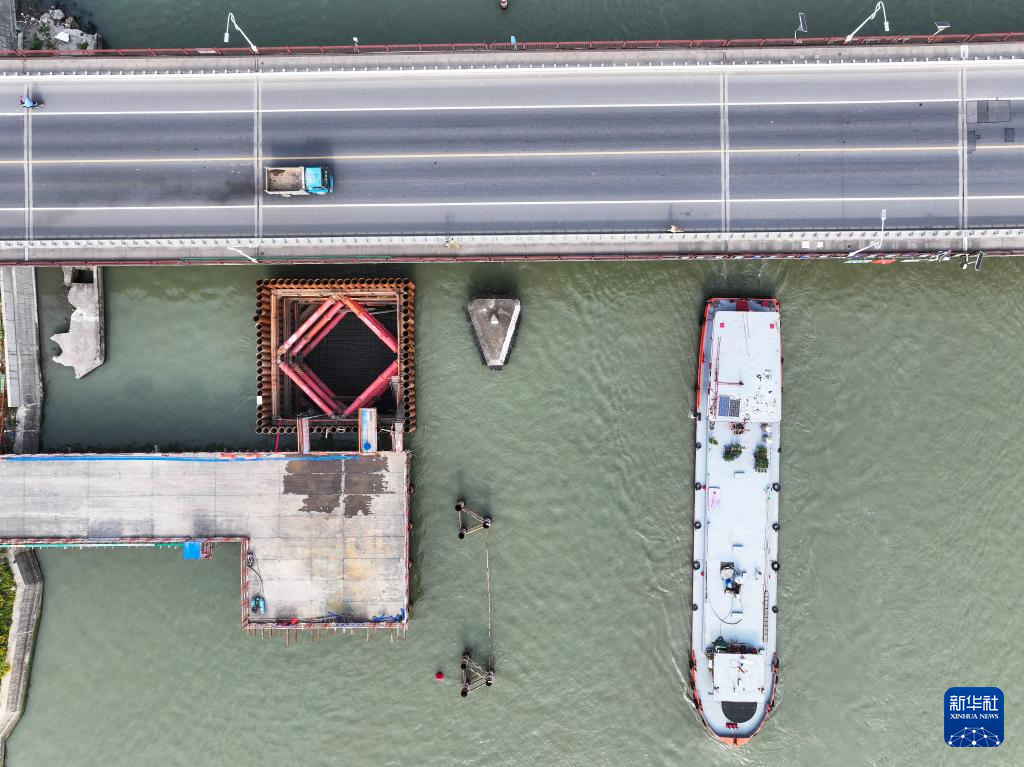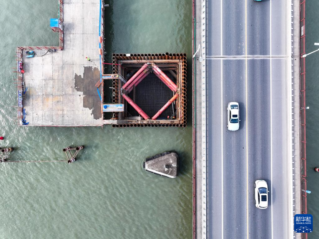 6月4日,中铁建城通公司施工人员在左幅主墩围堰作业(无人机照片)。
