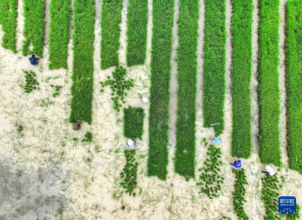 6月5日,江苏省连云港市灌云县下车镇顾圩村村民在水稻秧田里起秧。