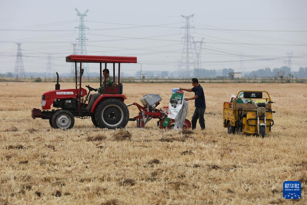 6月5日,河南省平顶山市宝丰县石桥镇交马岭村农民在给农机添加玉米种子和肥料。
