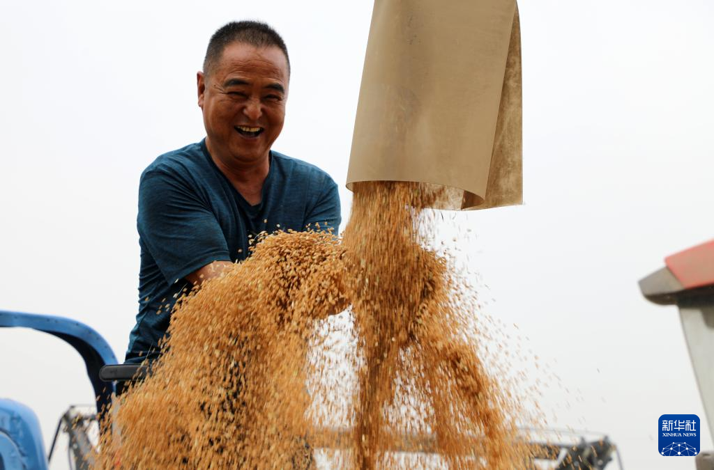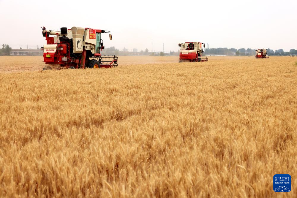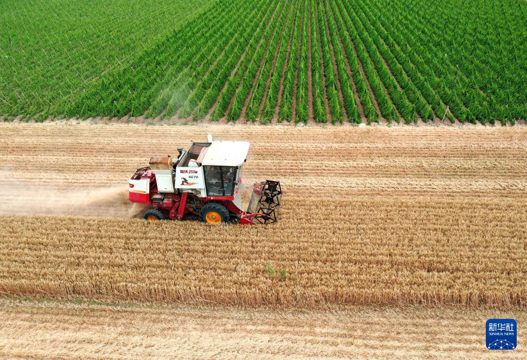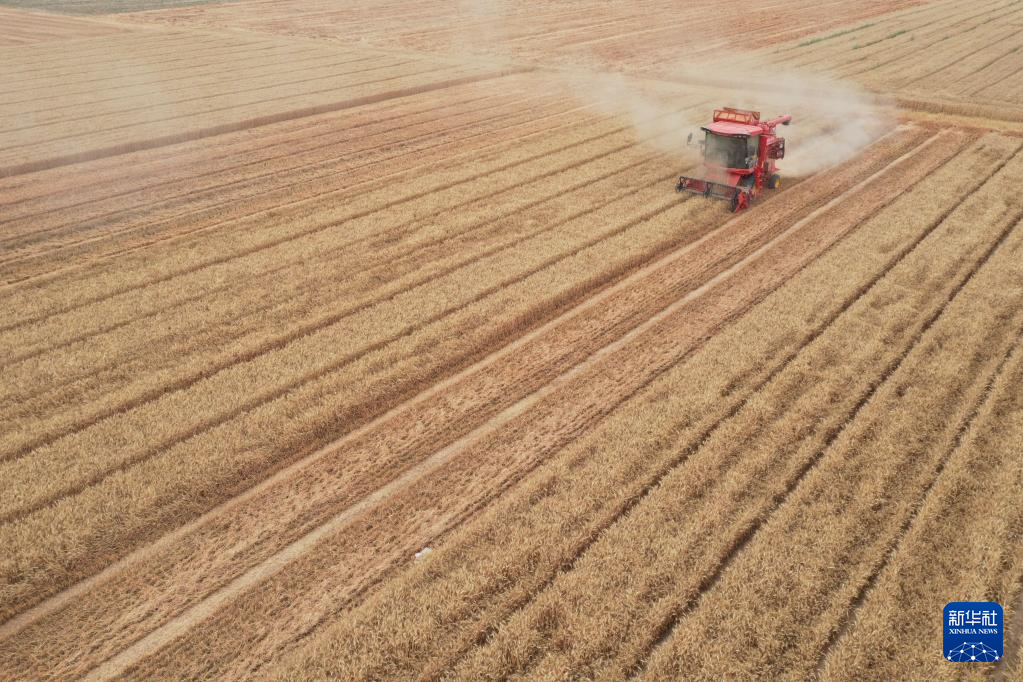 6月5日,在河南省焦作市博爱县孝敬镇东界沟村,农民在田间收获小麦。