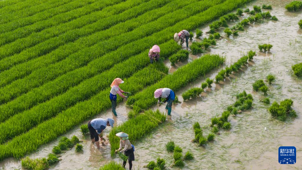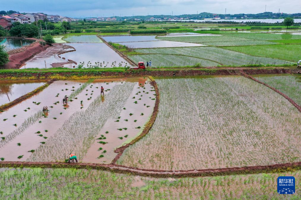 6月5日,湖南省常宁市兰江乡农民在田间插秧。