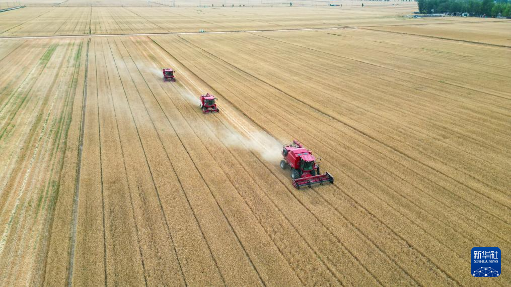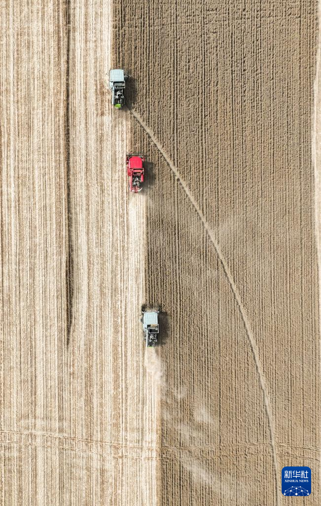 6月5日,在山东省东营市广饶县李鹊镇,联合收割机在抢收小麦(无人机照片)。