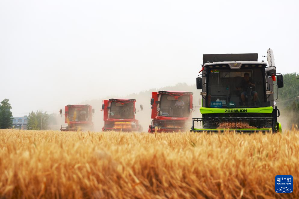6月5日,在山东省枣庄市峄城区古邵镇大辛庄村,农机手驾驶收割机在田间收割小麦。