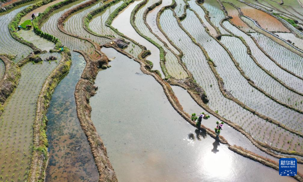 6月5日,在贵州省黔东南苗族侗族自治州从江县刚边壮族乡宰别村,村民在梯田里挑运秧苗(无人机照片)。