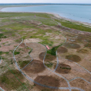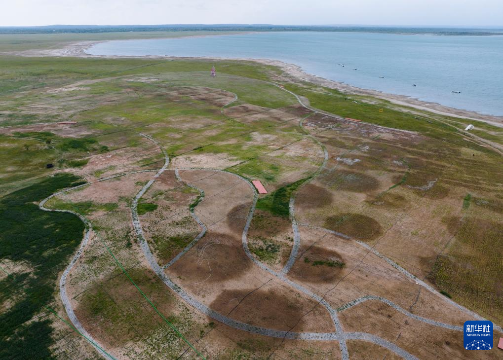 红碱淖国家级自然保护区内实施的湖滨退化草原修复项目(6月4日摄,无人机照片)。
