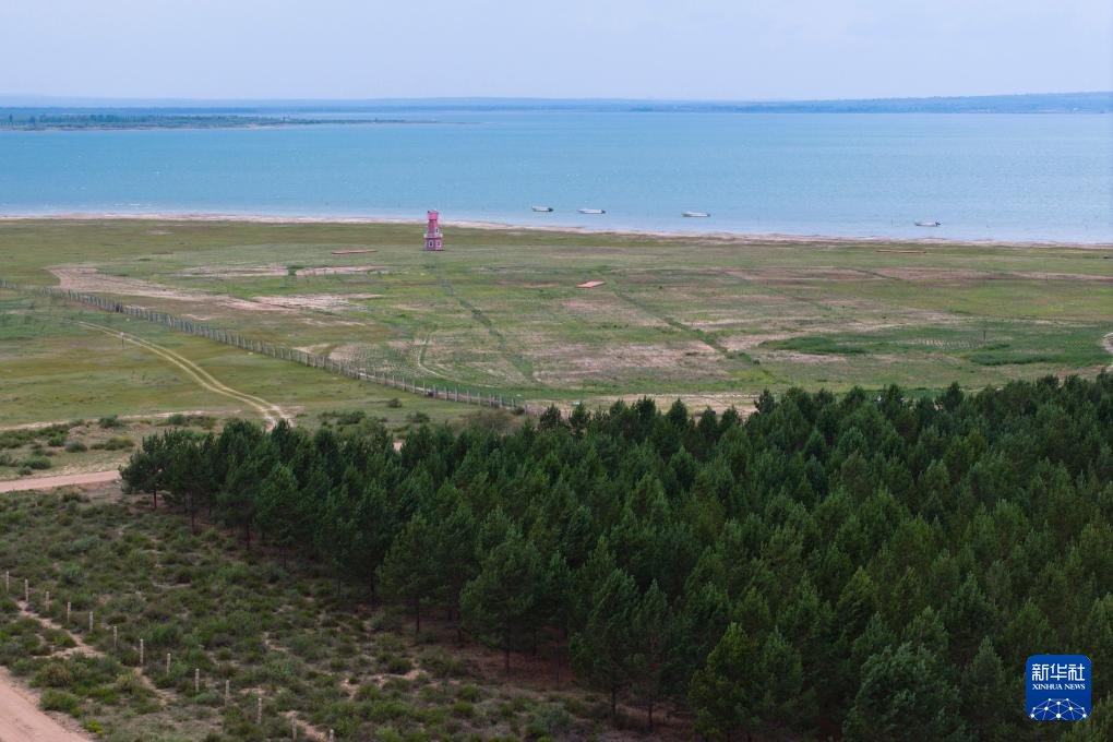红碱淖国家级自然保护区岸边栽植的树木(6月4日摄,无人机照片)。