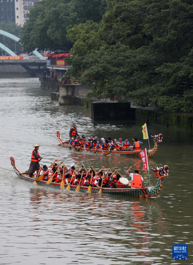 6月5日,龙舟队员在福建省龙岩市龙津河参加龙舟竞渡。