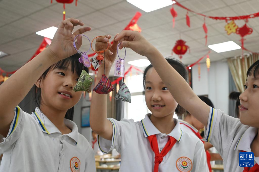 6月5日,河南省开封市向阳路小学的学生展示自己制作的香囊。