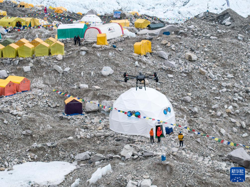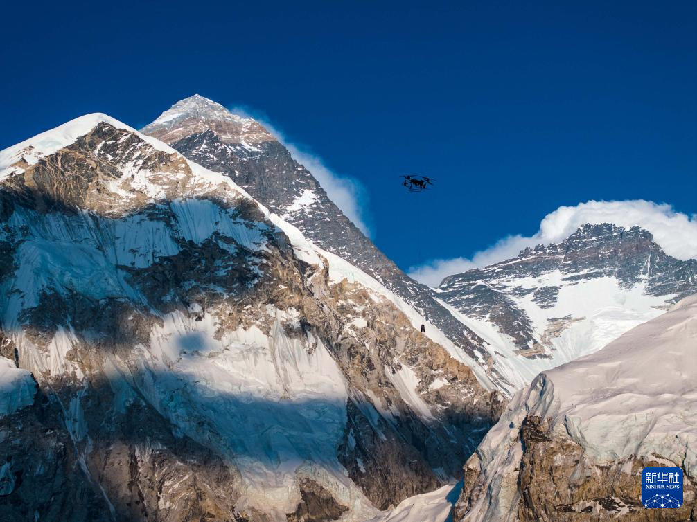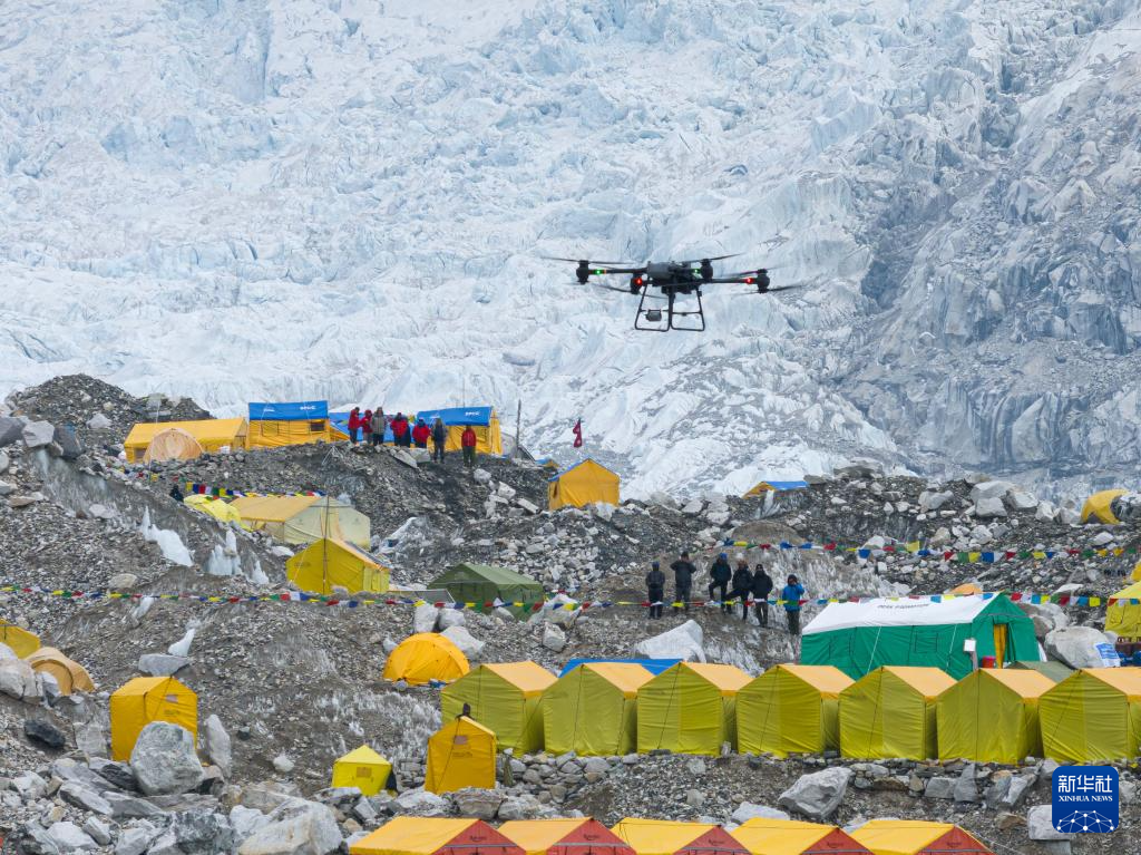 4月30日,大疆运载无人机从珠穆朗玛峰南坡大本营起飞(视频截图)。