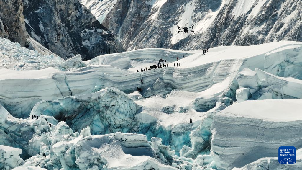 4月30日,大疆运载无人机在珠穆朗玛峰南坡昆布冰川进行物资运输测试(视频截图)。
