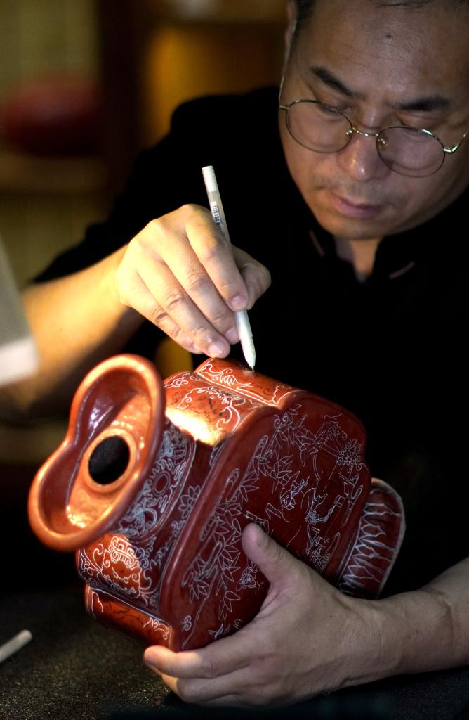 朱江在工作室为髹漆后的胎体绘制线稿(6月5日摄)。