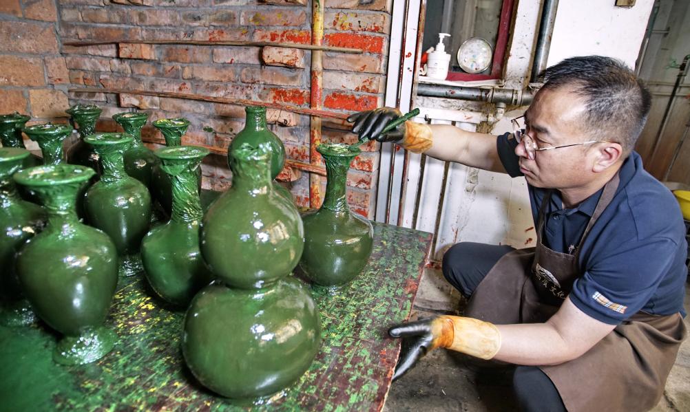 朱江在雕漆工作室对木胎盘子进行反复髹漆(5月30日摄)。