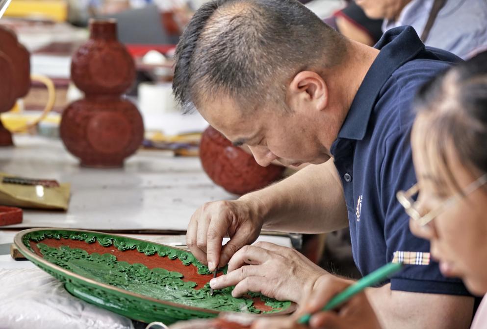 雕漆工艺是漆器胎上髹一定厚度的色漆,在漆上雕刻花纹的一种工艺,它的特点是工繁料贵、程序复杂、耗工繁巨、技艺高难。