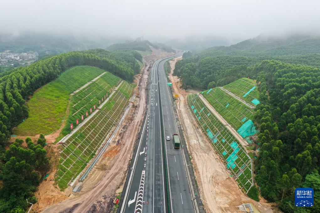 汕梅高速改造完成的高边坡防护带(6月5日摄,无人机照片)。