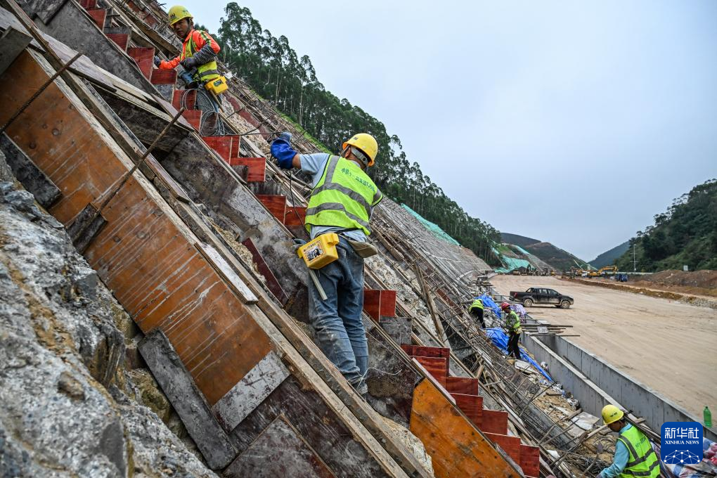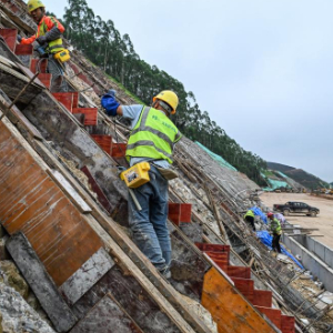 6月5日,施工人员在汕梅高速改扩建现场进行高边坡防护带施工。