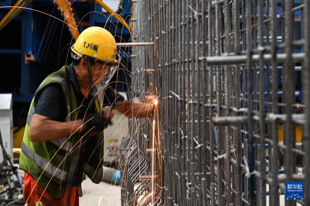 6月5日,施工人员在中铁十一局汕梅高速改扩建项目智慧梁场焊接作业。