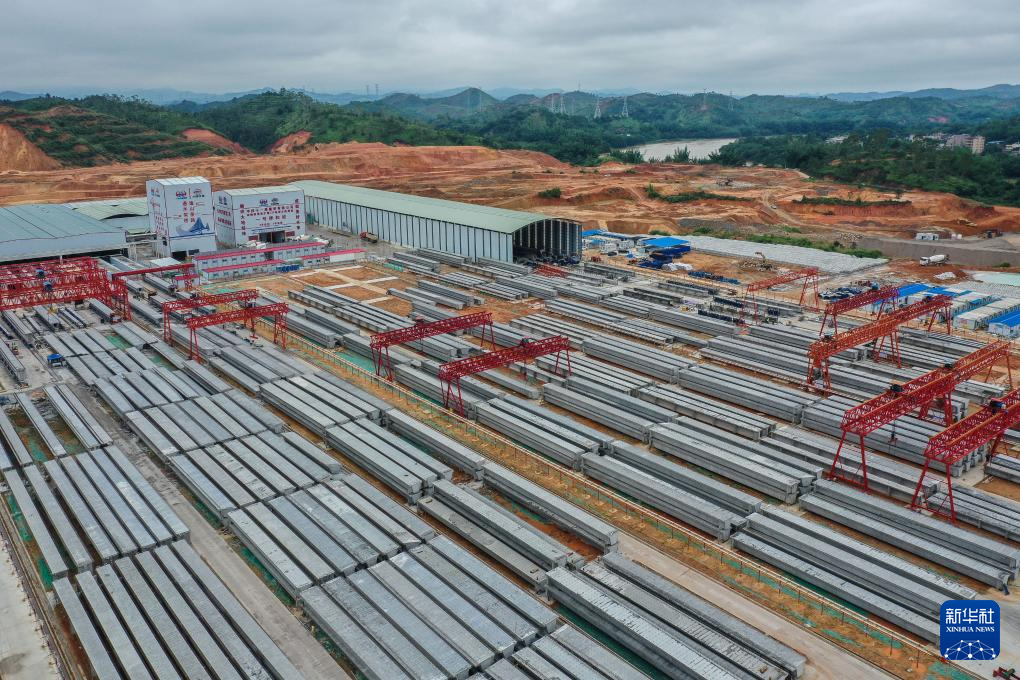中铁十一局汕梅高速改扩建项目智慧梁场预制好的路面箱梁(6月5日摄,无人机照片)。