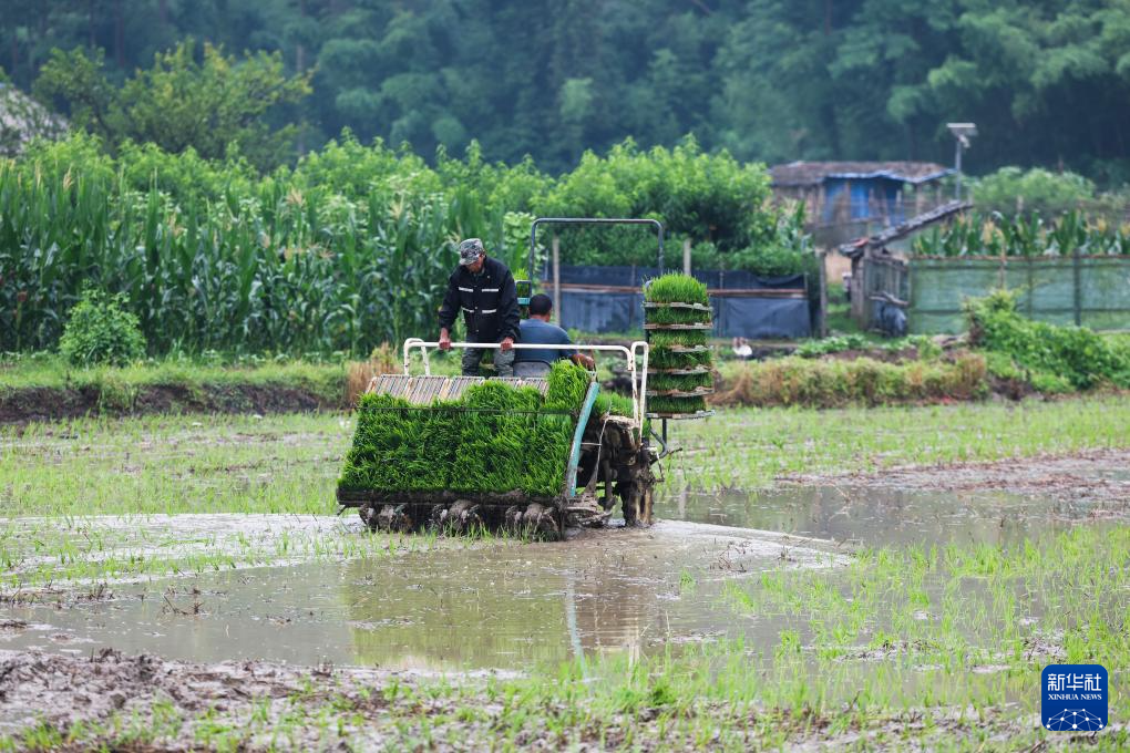6月5日,在东白湖镇新东村的稻田里,种植户操作插秧机进行插秧作业。