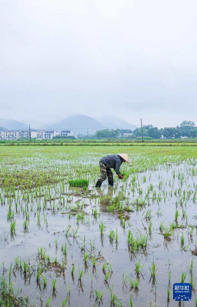 6月5日,在东白湖镇新东村的稻田里,种植户在人工补种水稻秧苗。