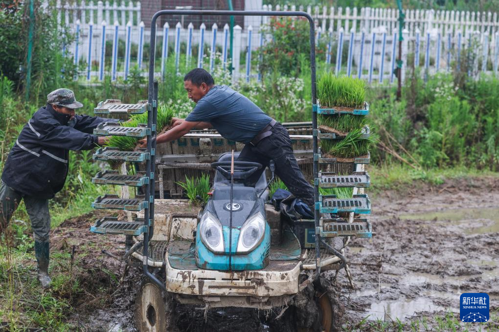 6月5日,在东白湖镇新东村大片的稻田里,种植户把水稻秧苗放到插秧机上。