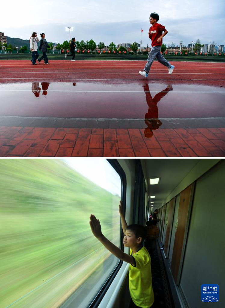 拼版照片:上图为2024年6月4日,邓广伟在贵州黔南科技学院的操场上跑步;下图为2014年7月29日,在搭乘火车从贵阳前往上海做眼部检查的途中,邓广伟看着车窗外的风景。