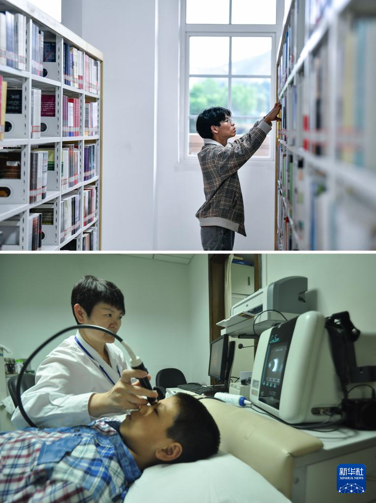 拼版照片:上图为2024年6月4日,邓广伟在贵州黔南科技学院的图书馆里翻阅图书;下图为2014年7月31日,邓广伟在上海复旦大学附属眼耳鼻喉科医院接受术前检查。