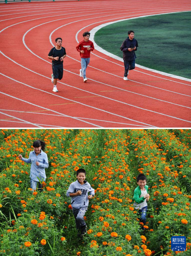 拼版照片:上图为2024年6月4日,邓广伟(中)与同学在贵州黔南科技学院的操场上跑步;下图为2015年8月19日,成功换上义眼的邓广伟(中)与同学在贵州威宁县老家的花田里玩耍。