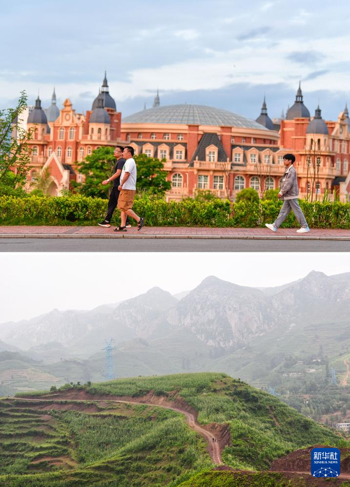 拼版照片:上图为2024年6月4日,邓广伟(右)在贵州黔南科技学院的校园里行走;下图为2014年7月27日,邓广伟与父亲从贵州威宁县的老家步行到镇上转车,准备前往上海检查眼睛。