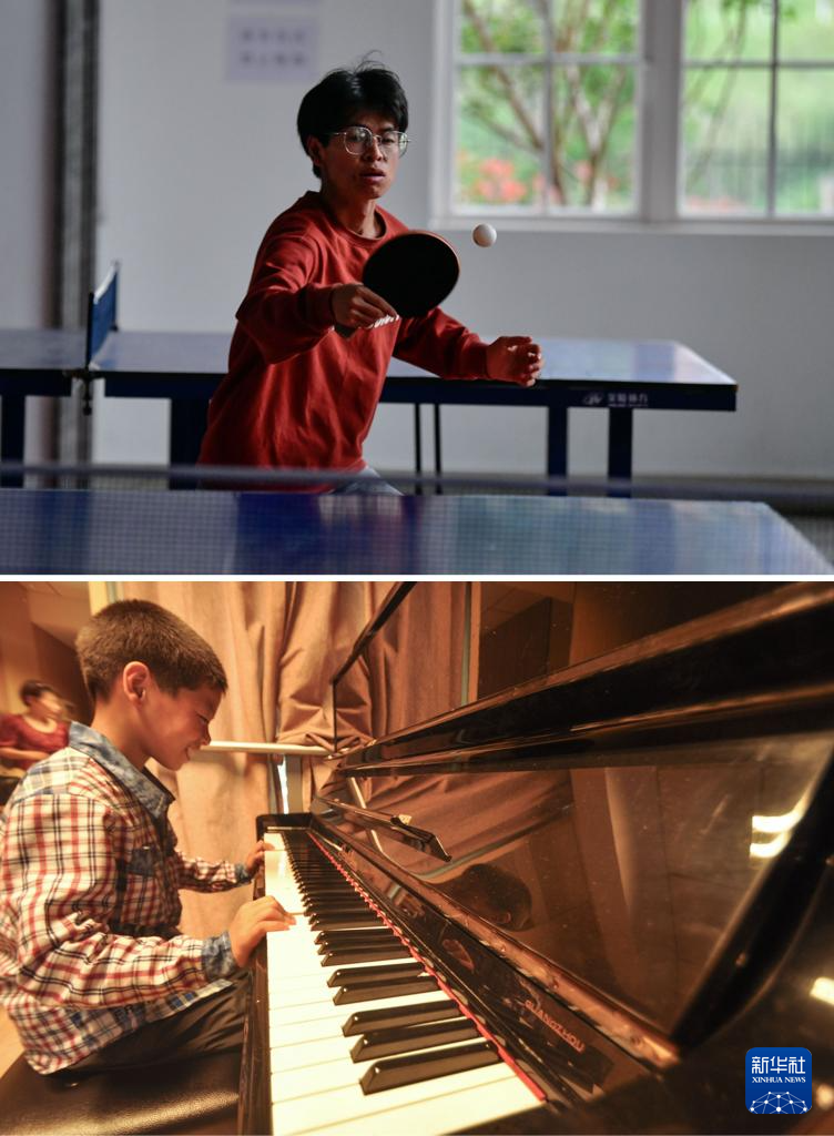 拼版照片:上图为2024年6月4日,邓广伟在贵州黔南科技学院的体育馆打乒乓球;下图为2014年7月27日,在上海治疗眼睛期间,爱心人士把邓广伟带到上海音乐学院,他第一次触摸到钢琴。