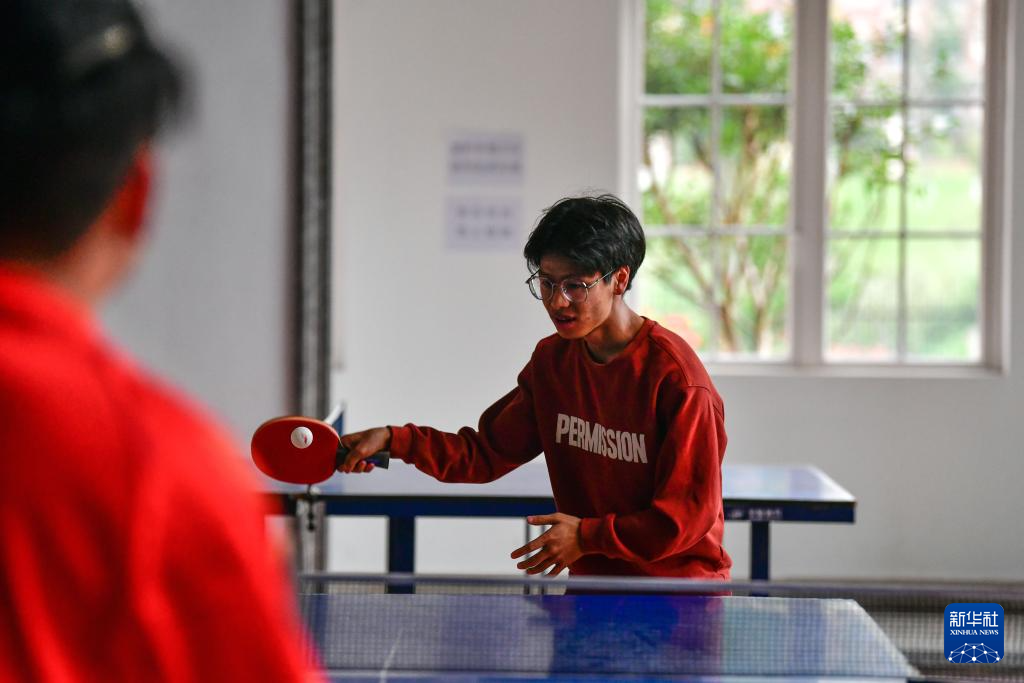 6月4日,邓广伟与同学在贵州黔南科技学院的体育馆打乒乓球。