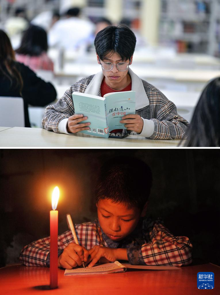 拼版照片:上图为2024年6月4日,邓广伟在贵州黔南科技学院的图书馆阅读课外书;下图为2014年7月27日,邓广伟在贵州威宁县农村老家点着蜡烛做作业。