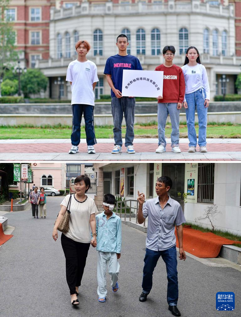 拼版照片:上图为2024年6月5日,邓广伟(右二)与同学们在贵州黔南科技学院里展示公司的牌子;下图为2015年7月17日,爱心人士范女士(左)陪同手术后的邓广伟在上海街头散步。