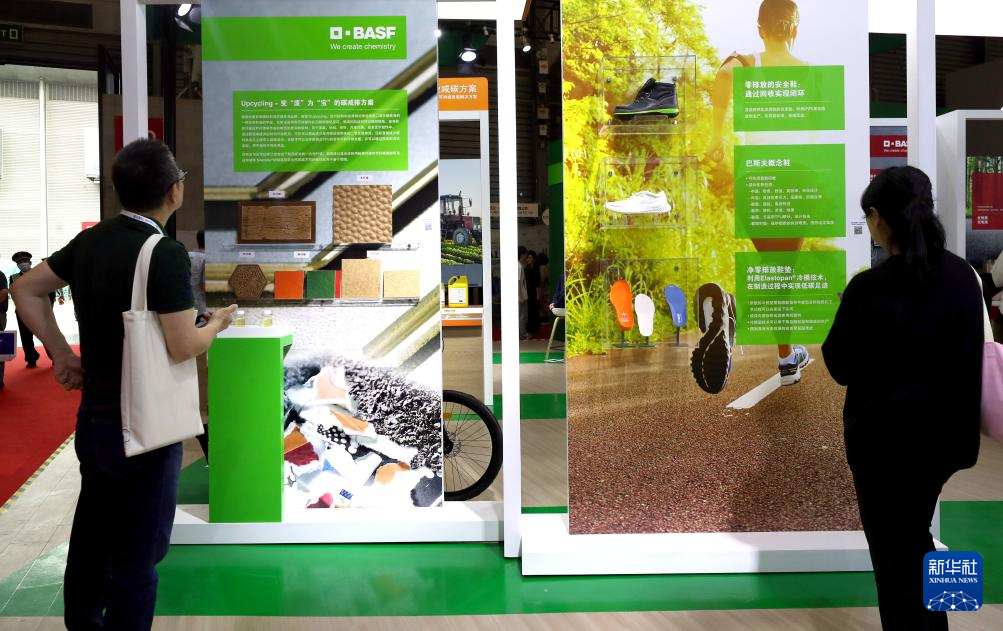 6月6日,参观者在巴斯夫公司展台观看介绍减碳方案的展板。