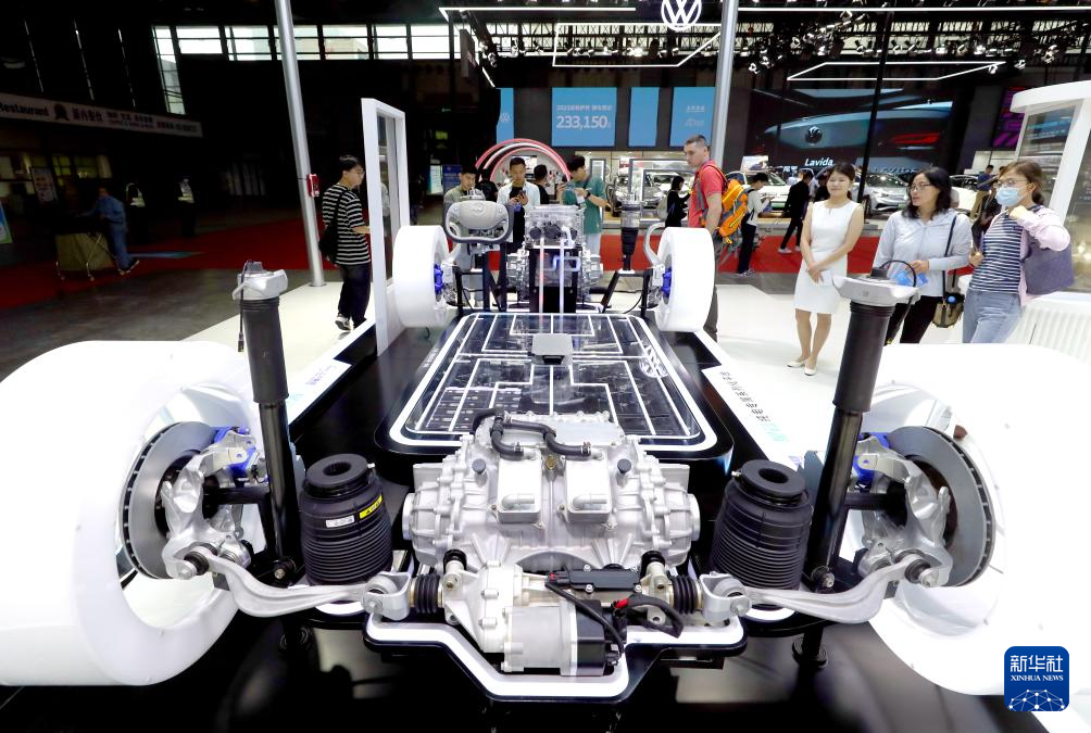 6月6日,参观者在上汽集团绿云纯电专属系列化平台展示模型前驻足观看。