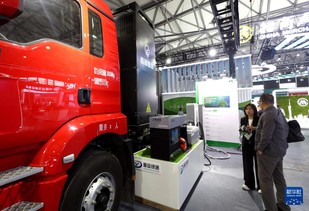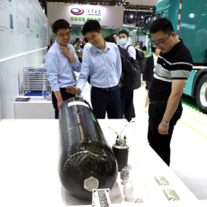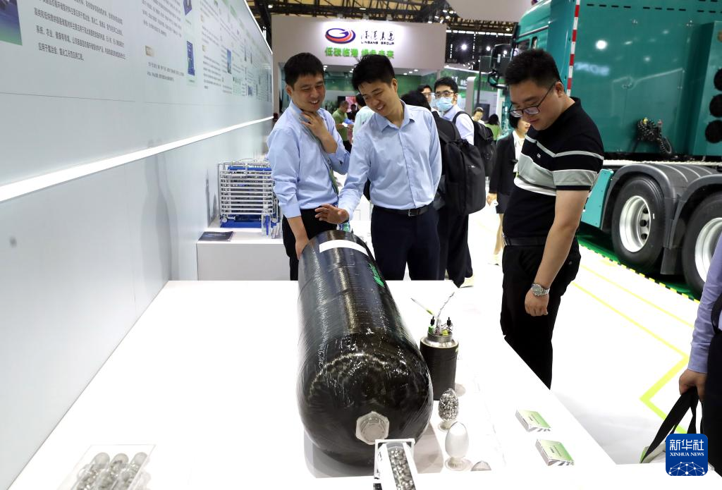 6月6日,参观者在临港集团展台的一个四型储氢罐展品前驻足观看。