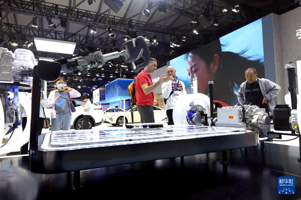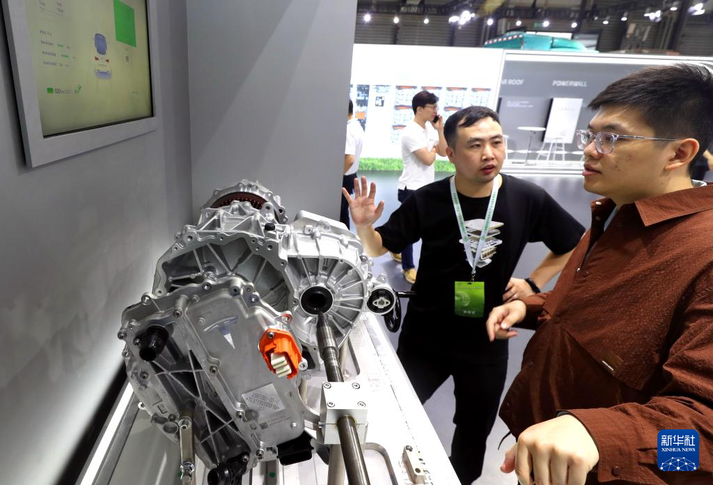 6月6日,一名工作人员(左)向参观者介绍特斯拉汽车的电驱系统展品。