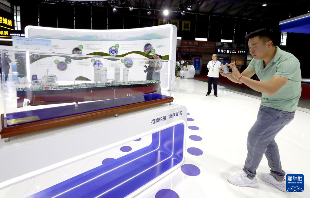 6月6日,一名参观者在招商局集团展台拍摄第二代风帆系统示范船“新伊敦”轮的模型。