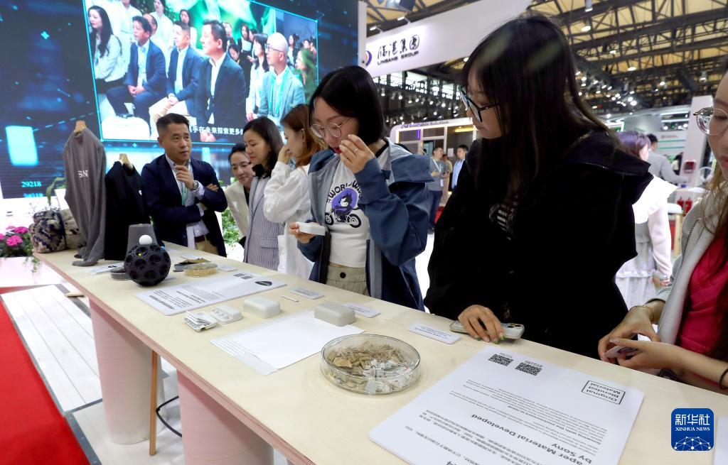 6月6日,参观者在展会上了解利用废旧材料制作的包装材料。