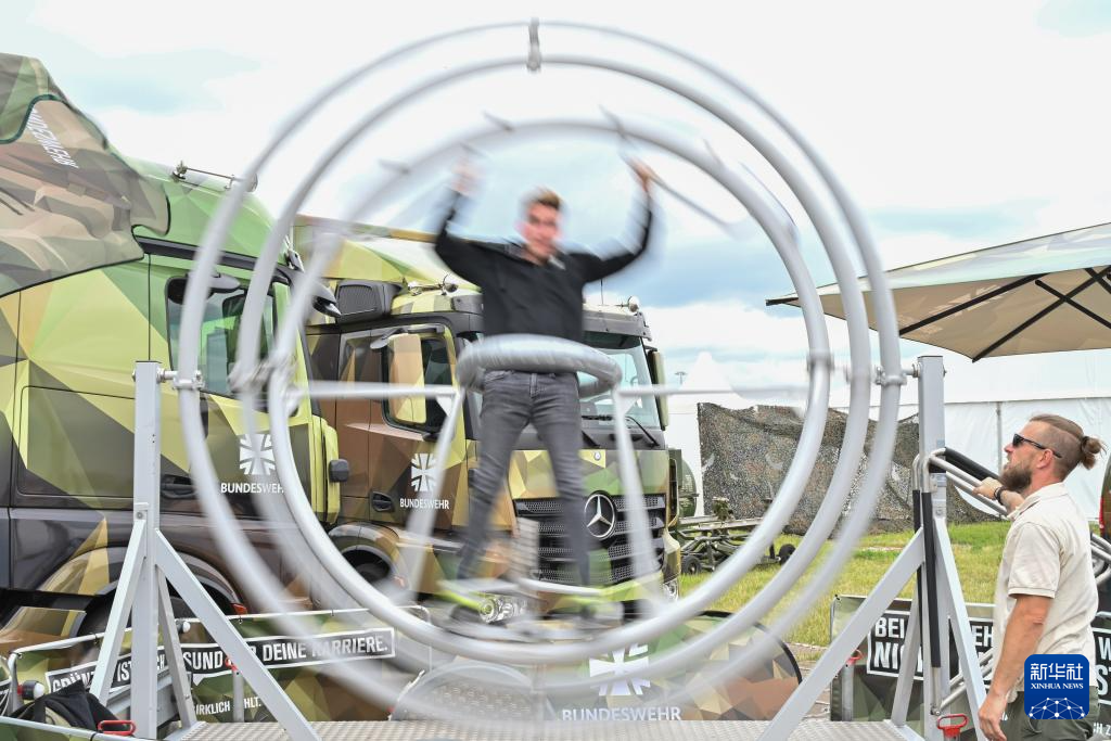 6月5日,在德国舍内费尔德,参观者在2024柏林国际航空展上体验飞行员滚轮训练。