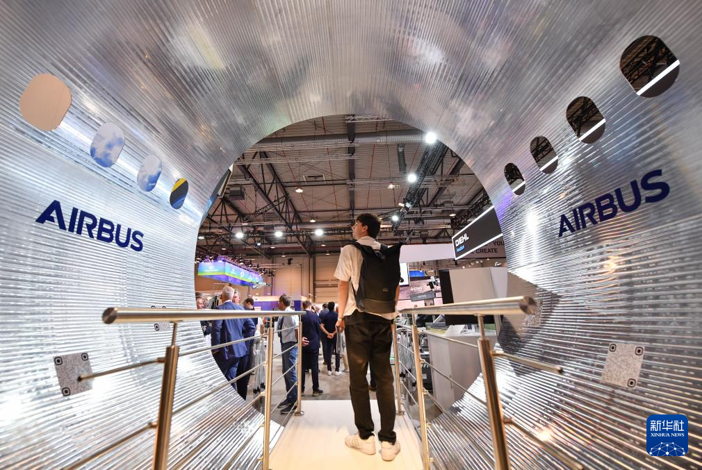 6月5日,在德国舍内费尔德,一名男子在2024柏林国际航空展上的空客公司展区参观。