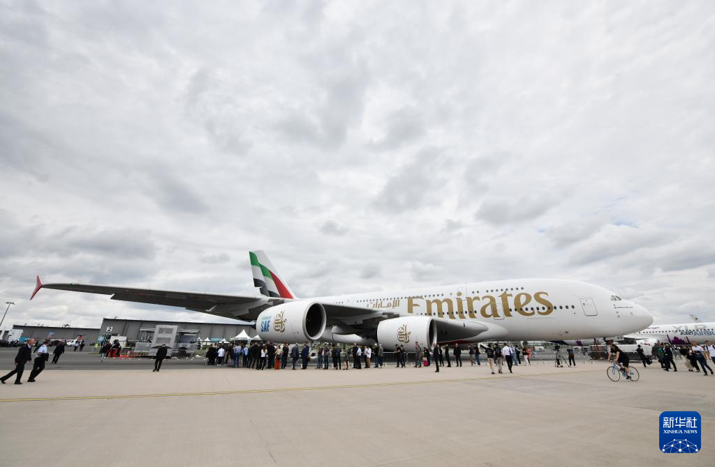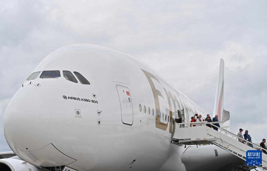 6月5日,在德国舍内费尔德,人们在2024柏林国际航空展上参观阿联酋航空公司空客A380-800客机。