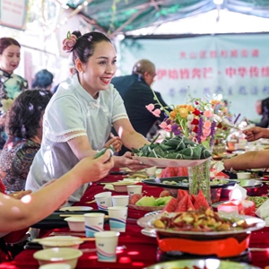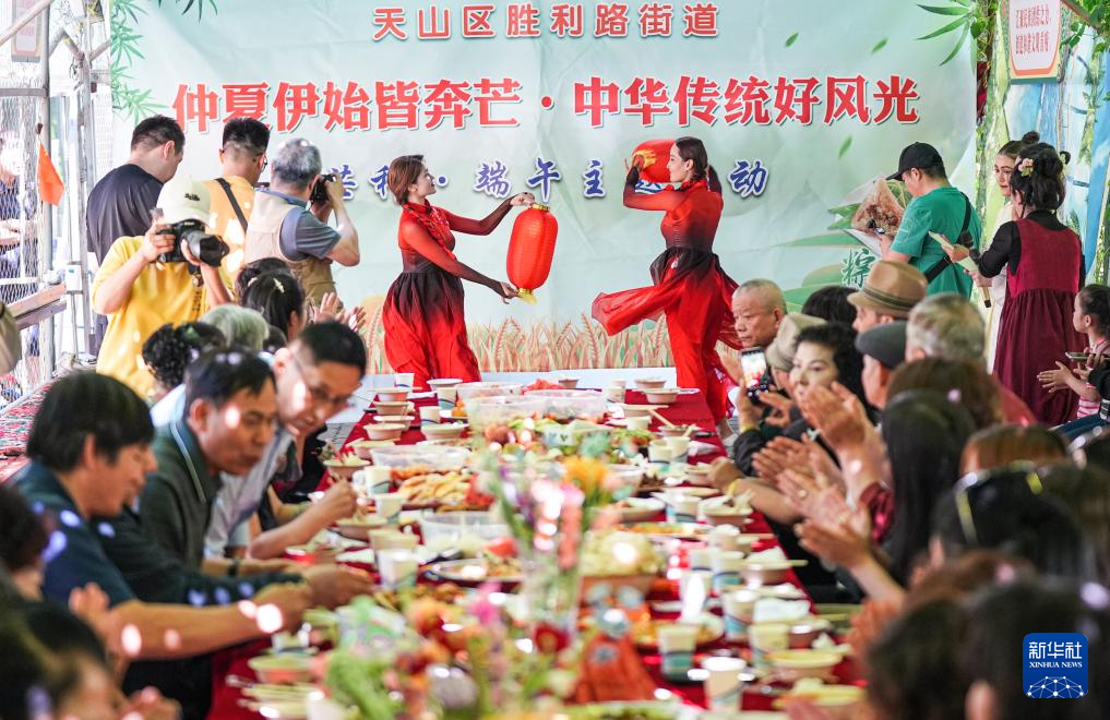 6月5日,居民在乌鲁木齐市天山区胜利路街道迎端午活动中品尝“百家宴”美食。