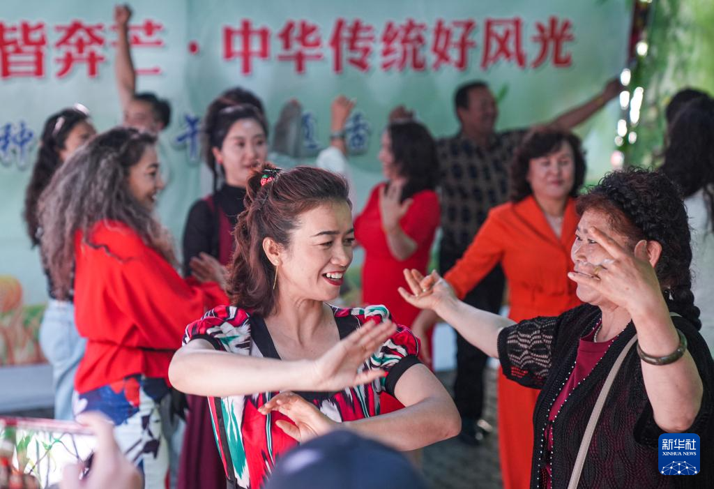 6月5日,居民在乌鲁木齐市天山区胜利路街道迎端午活动中跳舞。