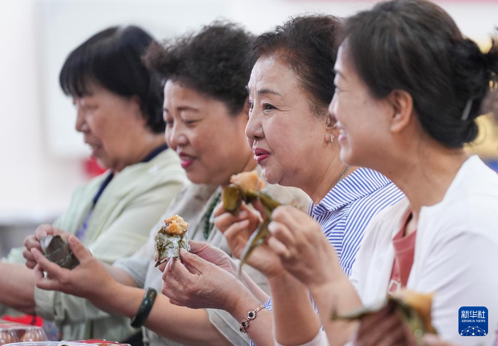 6月6日,居民在乌鲁木齐市天山区固原巷社区迎端午活动中品尝粽子。