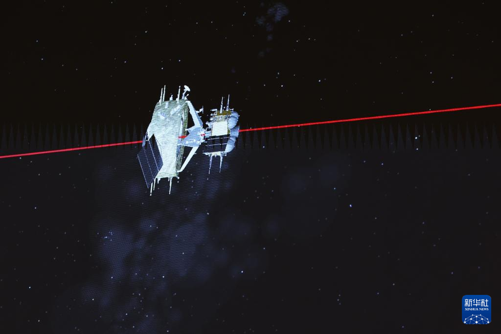 6月6日在北京航天飞行控制中心大屏幕上拍摄的嫦娥六号月球轨道交会对接与在轨样品转移动画模拟画面。