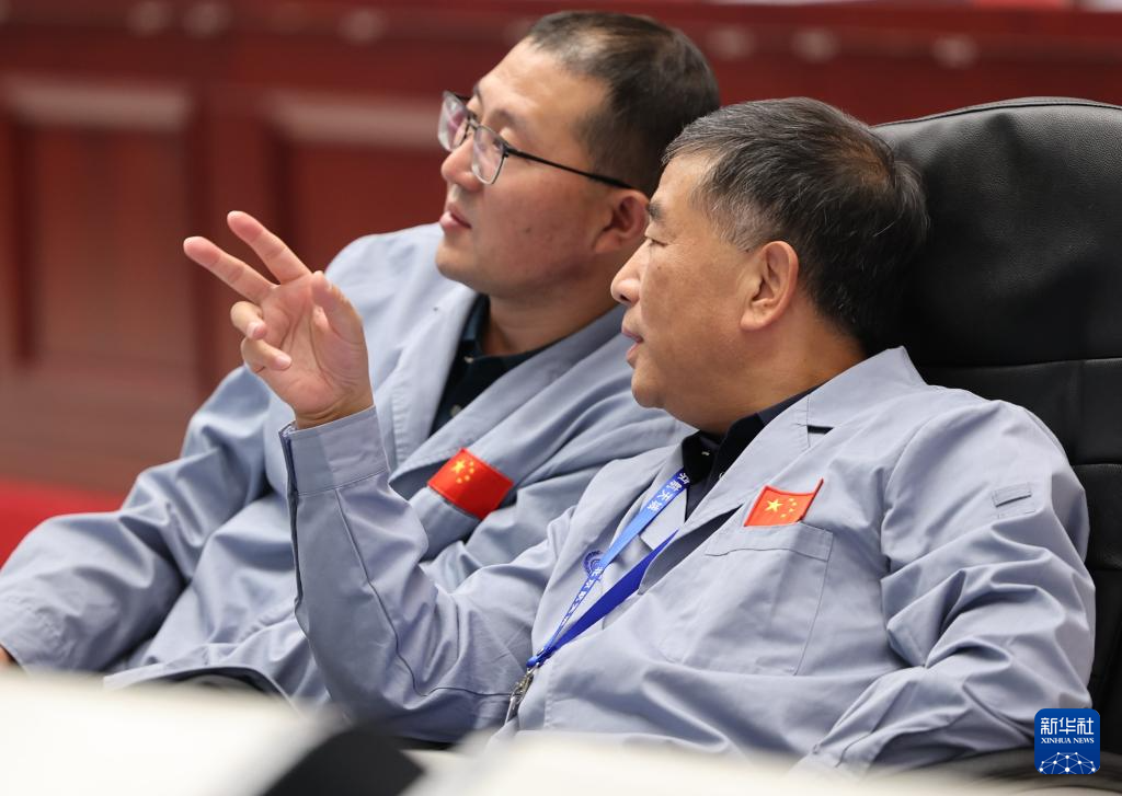 6月6日,在北京航天飞行控制中心,嫦娥六号任务总设计师胡浩(右)和探月与航天工程中心主任关锋在交流交会对接进展情况。