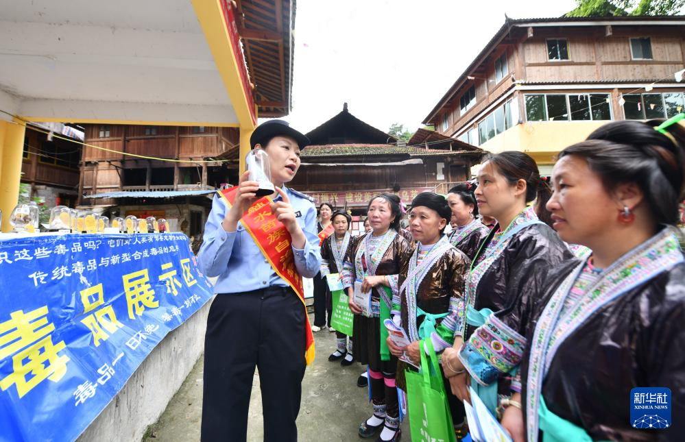 当日,广西柳州市融水苗族自治县禁毒办、公安局在该县杆洞乡党鸠村开展禁毒知识进苗寨宣传教育活动,帮助群众了解毒品对个人、家庭和社会的危害,增强禁毒意识。