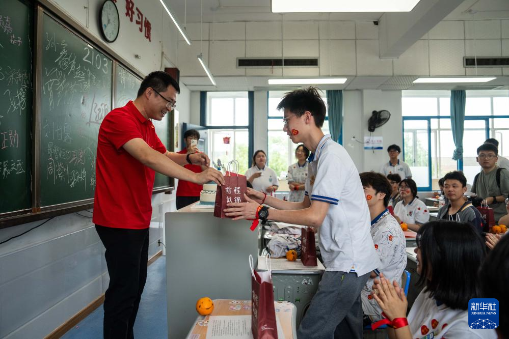 6月6日,在长沙市同升湖高级中学,师生们举起印有“前程似锦”的考前礼包合影。