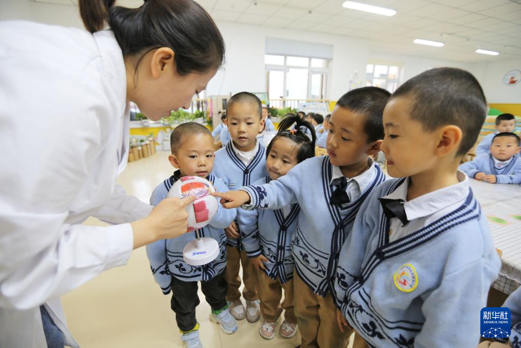 6月6日,甘肃省定西市安定区实验幼儿园的老师给小朋友们讲解眼球构造知识。