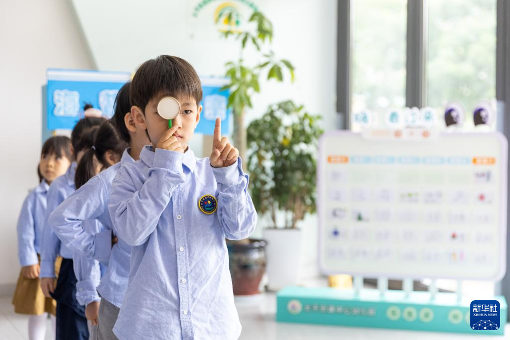 6月6日,浙江省温岭市太平街道中心幼儿园的小朋友在检测视力。